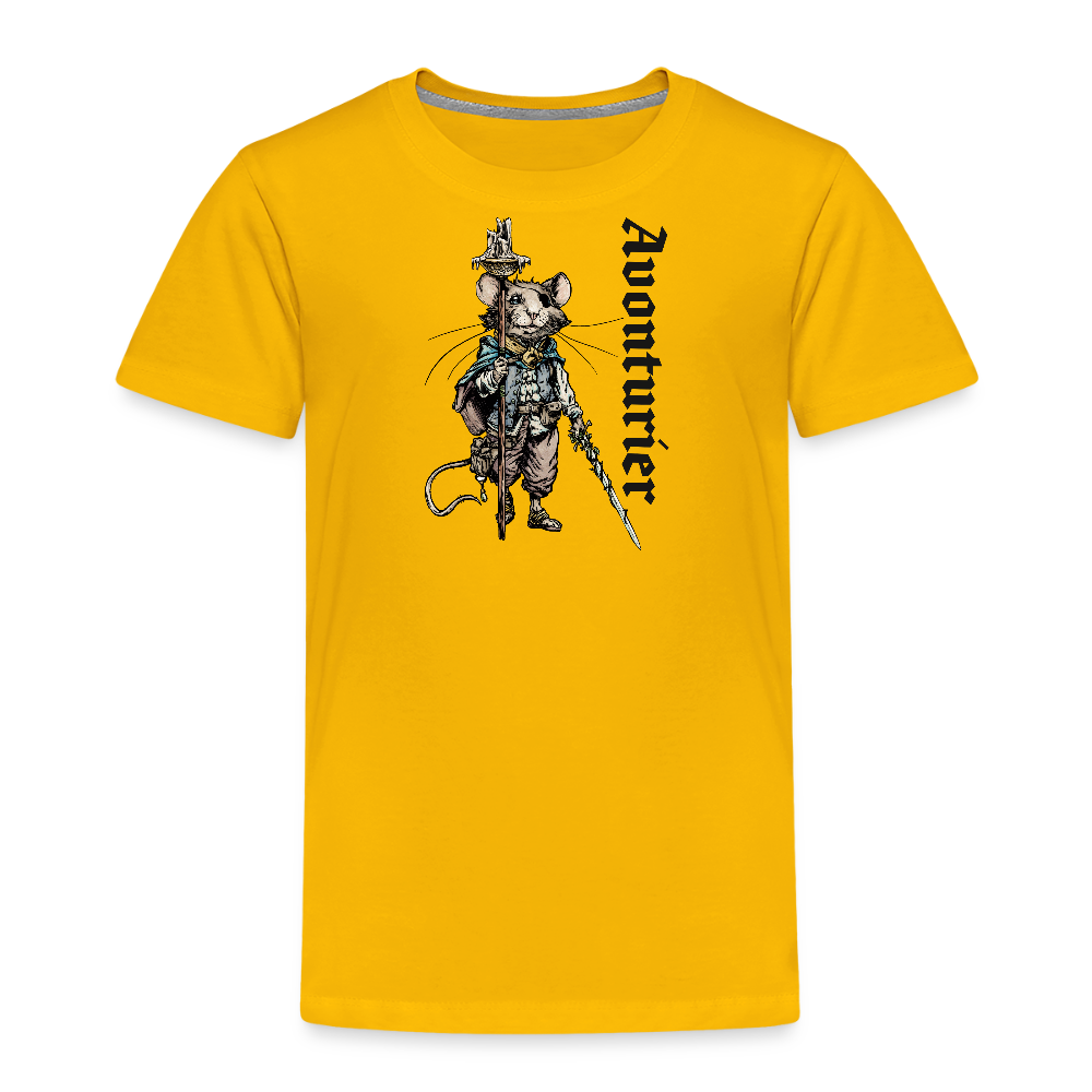 T-shirt met afbeelding van een muisavonturier en de tekst ‘Avonturier’. Afbeelding in kleur, tekst in zwart gedrukt. T-shirt beschikbaar in verschillende kleuren.