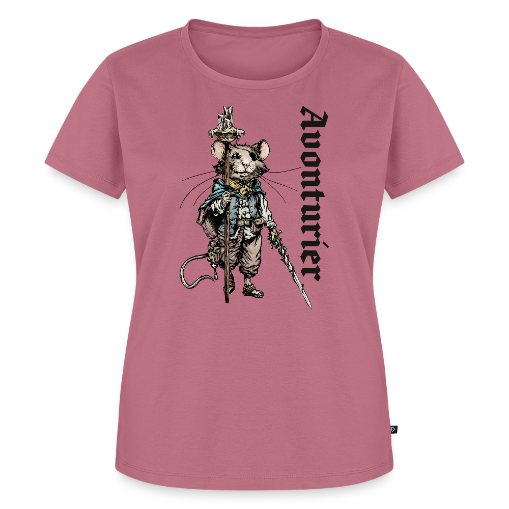 T-shirt met afbeelding van een muisavonturier en de tekst ‘Avonturier’. Afbeelding in kleur, tekst in zwart gedrukt. T-shirt beschikbaar in verschillende lichte kleuren. Voor donkere kleuren t-shirt: zie de andere opties in de webwinkel.
