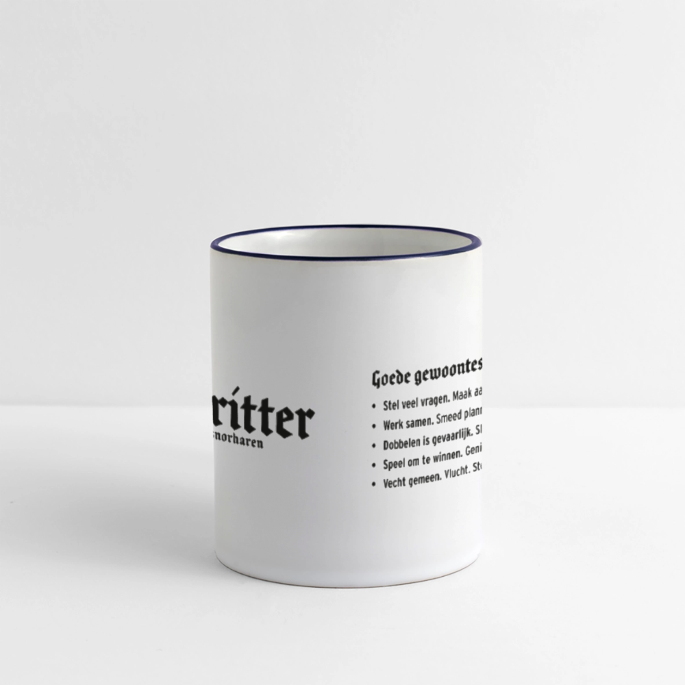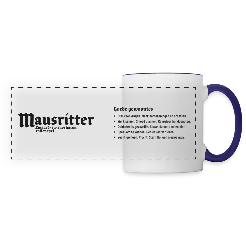 Mok met de Goede Gewoontes van Mausritter (Nederlandstalig). Handig om op tafel te hebben! Beschikbaar met verschillende kleuren handgreep.
