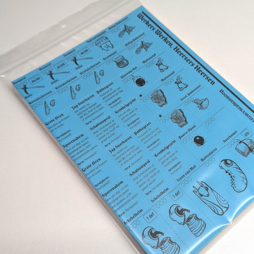 Het sessieblad en de voorwerpen- en conditiekaartjes zijn geschikt om met whiteboard marker (uitwisbare stift) te beschrijven. Handig om tijdens een sessie de voortgang van het spel en het gebruik van voorwerpen bij te houden. De voorwerpen- en conditiekaartjes zijn geperforeerd, dus makkelijk af te scheuren. Er zitten ook een aantal blanco kaartjes bij, zodat je tijdens het spel je eigen voorwerpen of condities kan maken.